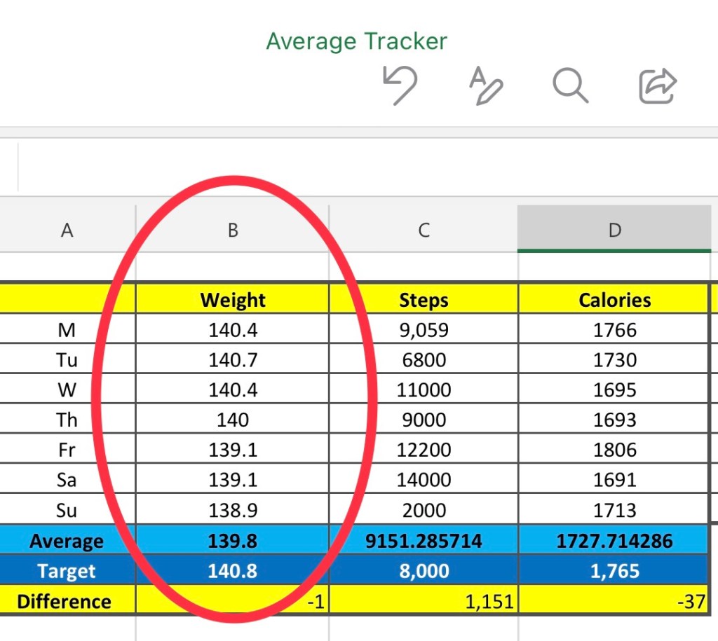 Notice my target weight, this number was my average from the previous week. The difference to look for is -.5 to -1lbs between ‘average’ and ‘target’. Losing .5 to 1lb per week is most realistic for general weight loss. In this example the difference is -1lb for the week, which is right on target!